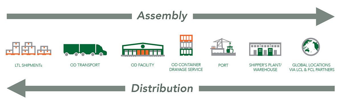 For global assembly, your vendors ship your LTL shipments to an OD facility serving the designated port city of exit. Your products are then consolidated into an ocean container. When the container is full and the load complete it is manifested to the destination of choice.